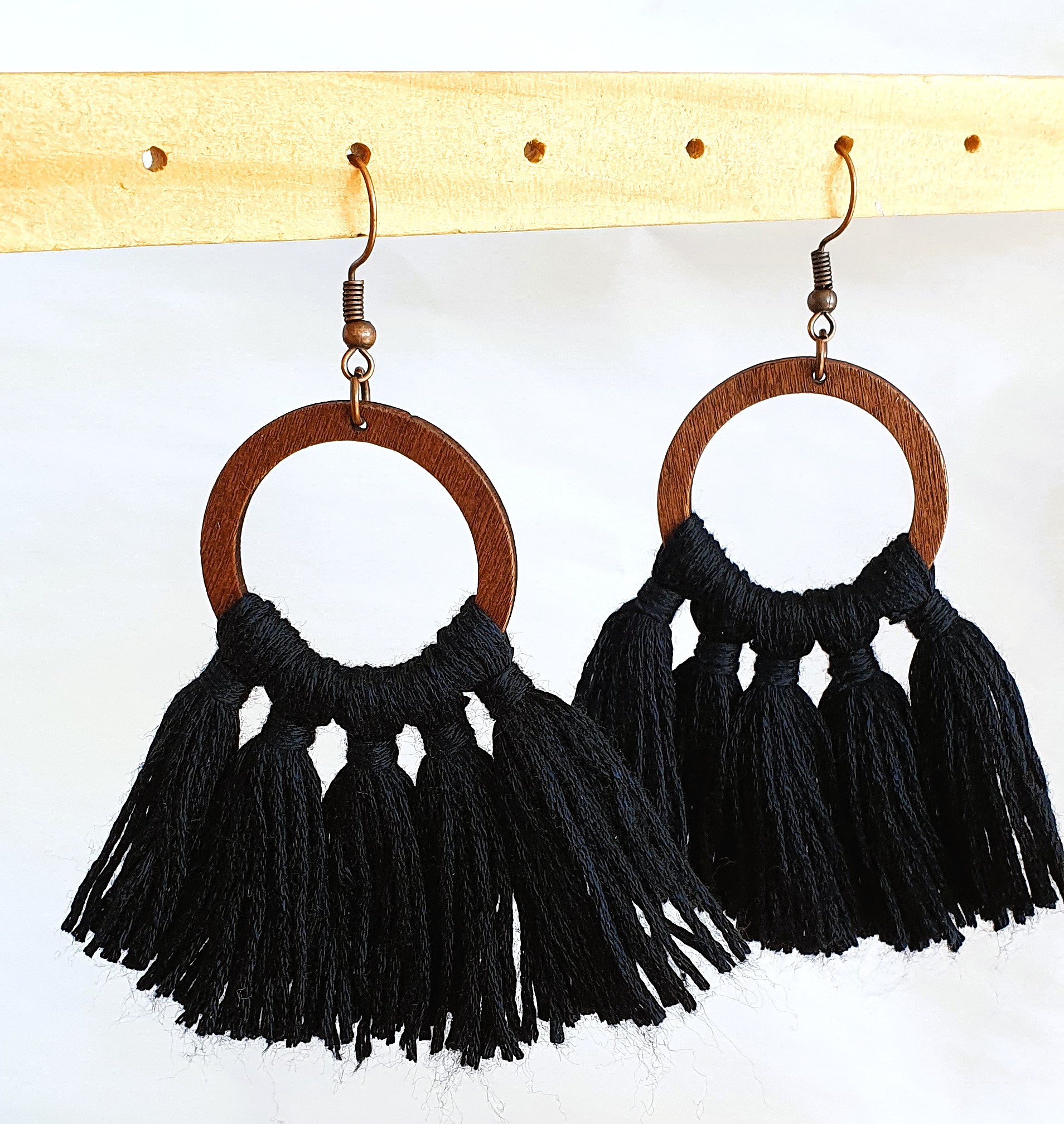 ✨ LIMITED TIME SALE! ✨ Get these vibrant boho-chic tassel earrings for just R100 (was R120)! Featuring natural wooden hoops and luxurious black cotton tassels, these 7cm statement-makers add playful movement to any outfit. Lightweight, nickel-free, and perfect for festival season.