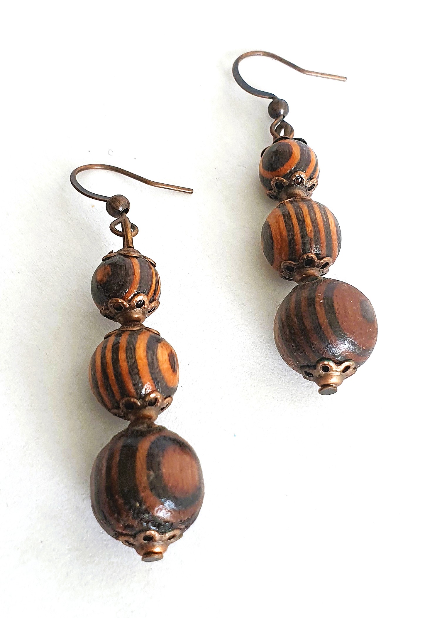 These wooden bead drop earrings from Stella’s Earrings feature a natural three-bead design with warm earthy tones and bronze accents.
