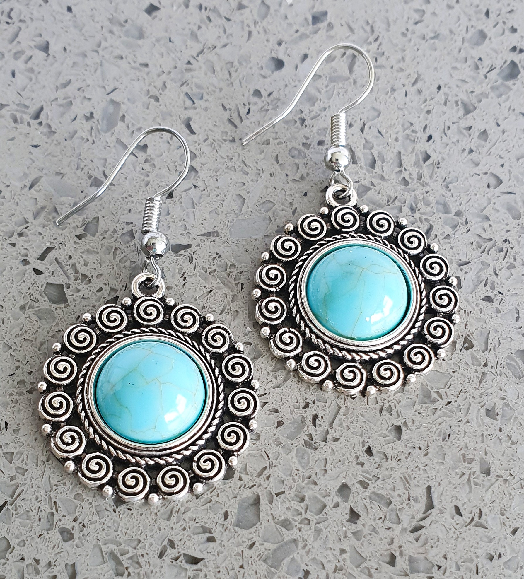 These Bohemian Dangle Earrings feature a stunning marble turquoise stone surrounded by 20 delicate antique silver twirls. Effortlessly elevate any look, day or night. Shop online (www.stellasearrings.co.za) or visit us in-store at Moreletapark. Stella’s Earrings are also available at The Coffee Pot Shop Moreletapark. Free delivery in Pretoria East. Call us to book an appointment to shop in-store: admin@stellasearrings.co.za or WhatsApp 066 531 2095. ✨ #bohostyle #marblelove #earringoftheday
